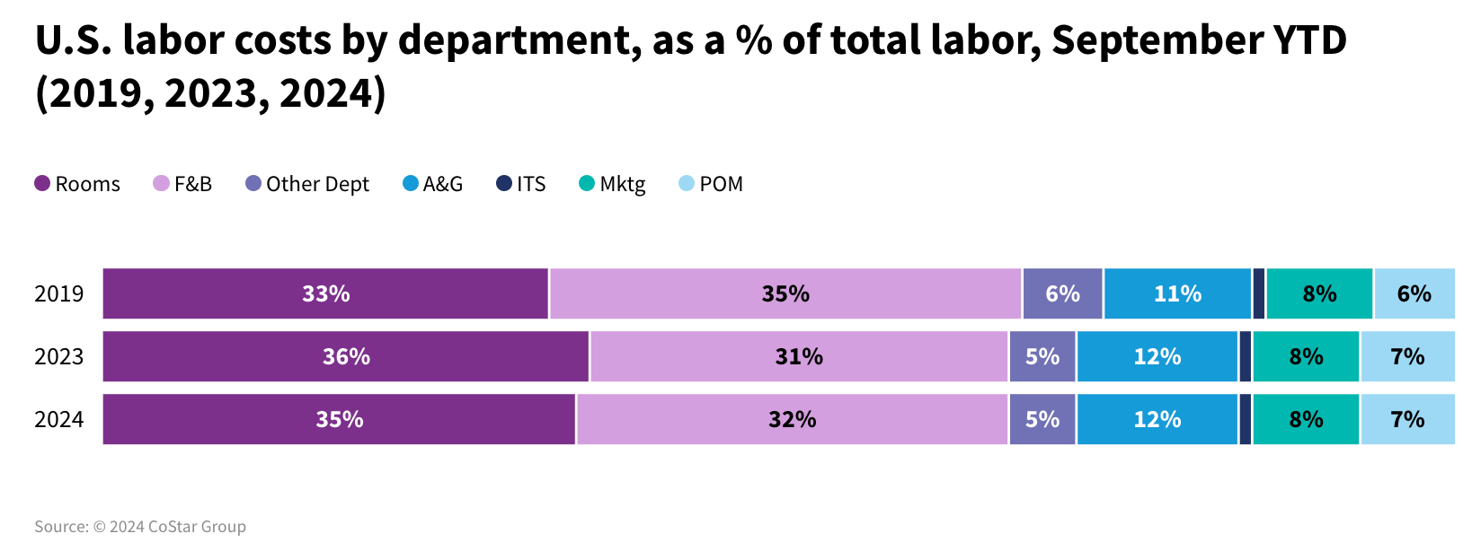 The article highlights how Food and Beverage labor costs are the primary driver of rising hotel staffing expenses in 2024, with a nearly 15% increase outpacing other departments. Group demand, fueled by events and meetings, has significantly boosted F&B revenues per occupied room, nearing pre-pandemic levels. The shift from contract to full-time F&B staff has also increased benefits expenses, further elevating costs. Year-to-date labor costs per available room (LPAR) are up 11%, putting pressure on profit margins, which have dropped to 35.4%. Urban markets, driven by group demand, have seen the highest labor cost growth. However, STR forecasts indicate a softening in labor cost growth in 2025, offering hope for improved profit margins.
