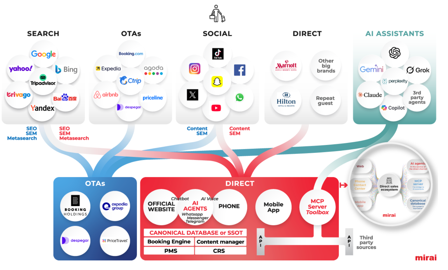 The article says direct distribution now has six parts. Websites, contact centers, and mobile apps still matter, but AI adds three more essentials. Hotels need AI agents that chat and book across channels, an MCP server that feeds assistants like ChatGPT real rates and rules and lets them complete reservations, and a clean canonical database as the single source of truth. The goal is a unified system where every channel shows consistent content, pricing, and availability so AI can find the hotel and help guests book directly.