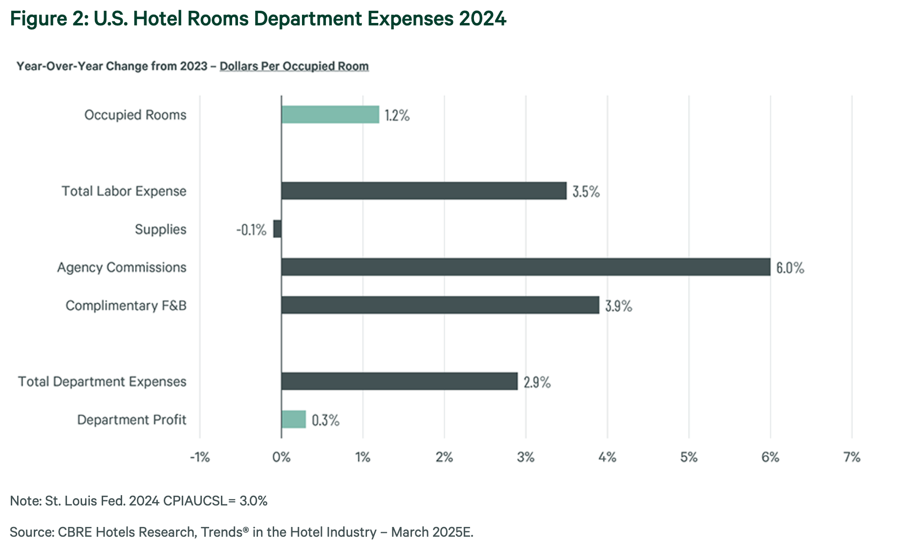 The article highlights the growing pressure on hotel profit margins due to operating expenses outpacing revenue growth. In 2024, costs above Gross Operating Profit (GOP) rose by 4.1%, while total hotel revenue increased by only 2.3%, leading to a decline in profitability. Key expense drivers included higher agency commissions, increased costs for complimentary food and beverage offerings, and rising labor and technology expenses. The article emphasizes the need for hotel operators to closely monitor and control these variable costs to maintain financial health in 2025.