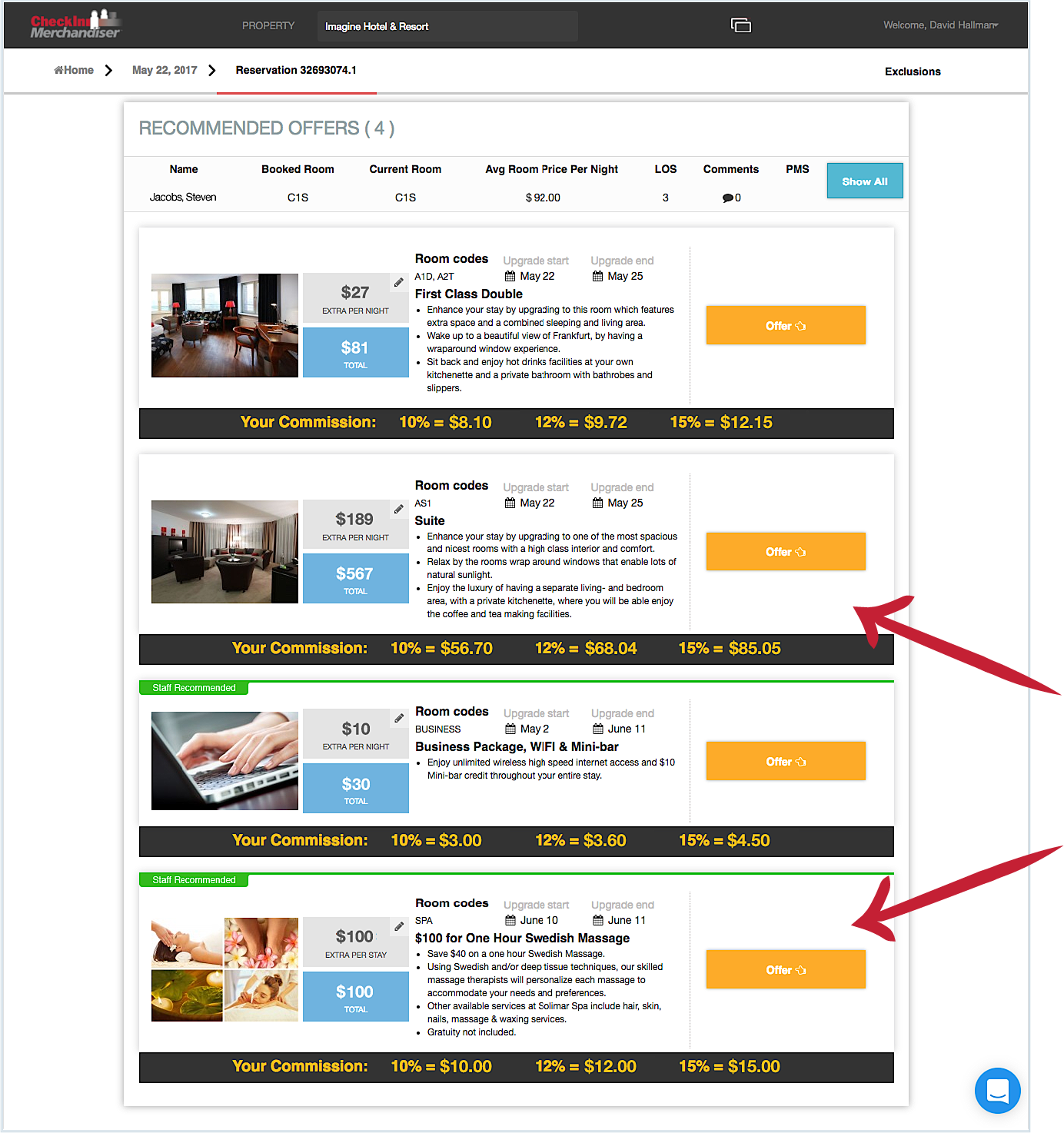 NOR1 takes all the fantastic features discussed above and puts them in an easy-to-use platform for the front desk staff to use upon guest's arrival. It means that the system will create custom and targeted upgrade offers and add-on offers for every arriving guest. All that front desk staff has to do is verbally communicate the proposal to the guest upon arrival. Then either accept the offer or decline it in the CheckIn Merchandising platform. Since it is connected to PMS, decisions will be automatically reflected there as well. Such a platform takes out the guesswork and helps the front desk agent quote the best price for the upgrade.