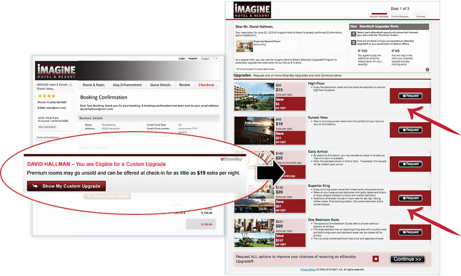 For example, a guest booked a room 15 days before the arrival date. Five days before arrival, the guest received the eStandby upgrade offer and declined it. NOR1 will send an eXpress targeted upgrade offer 72 hours before arrival. Guest will receive either an eStandby or eXpress Upgrade e-mail, never both. Same intelligence and machine learning are utilized for both upgrade types.