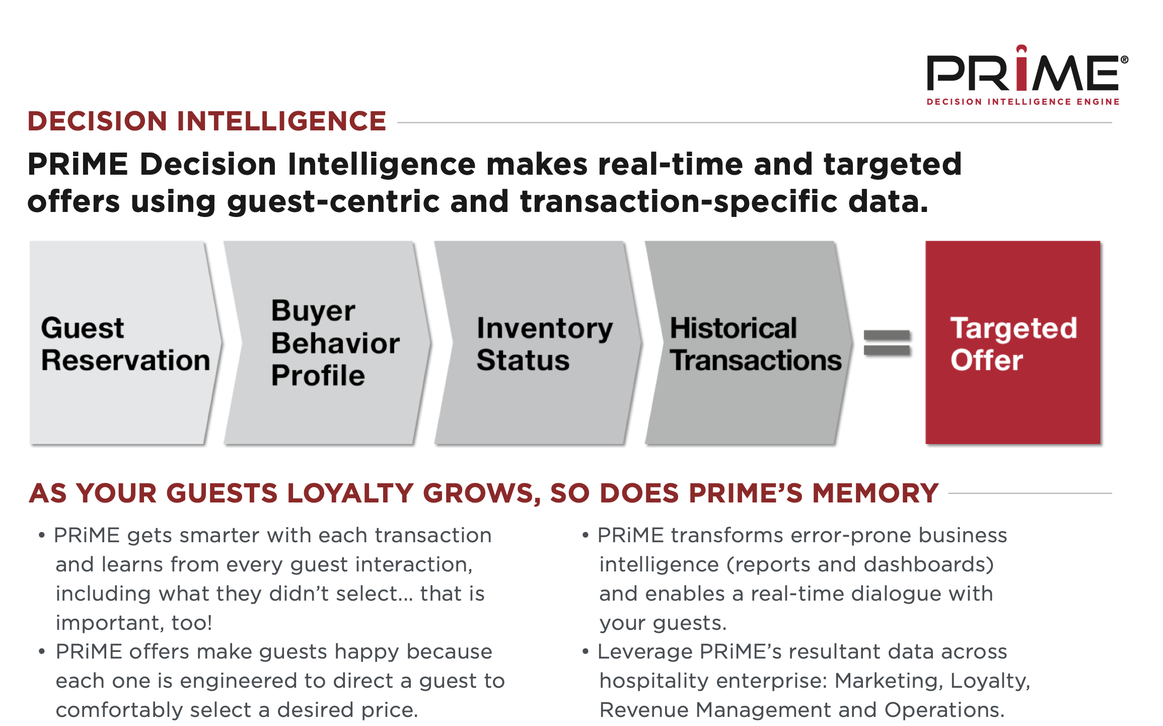 When information such as purchase history or travel preferences is utilized to create a dynamic customer experience, a deeper personal relationship develops between you and your guest. That’s why PRiME considers hundreds of variables and interactions, including: Length of stay, a number of guests, arrival day of the week, guest history, historical upsell data, originally booked price.