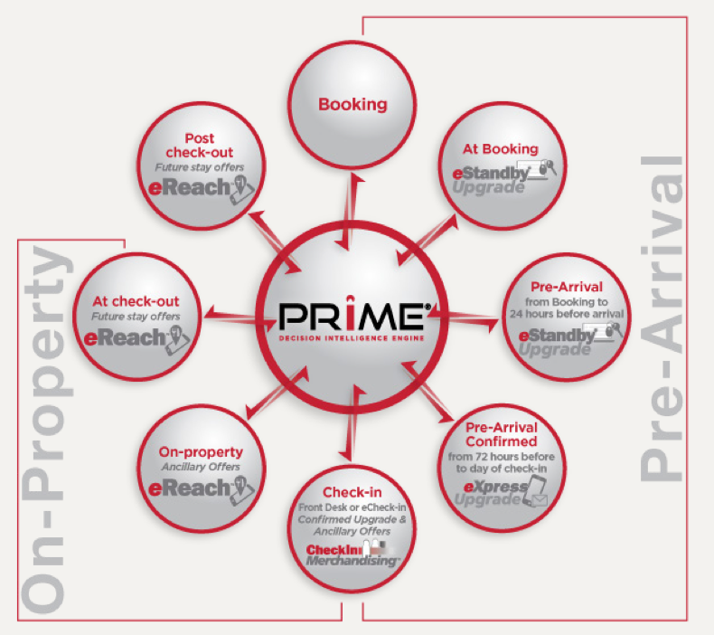 eReach allows for upselling during the last three stages of the guest journey: on-property (ancillary offers), check-out (future stay offers), and post-check-out (future stay offers).