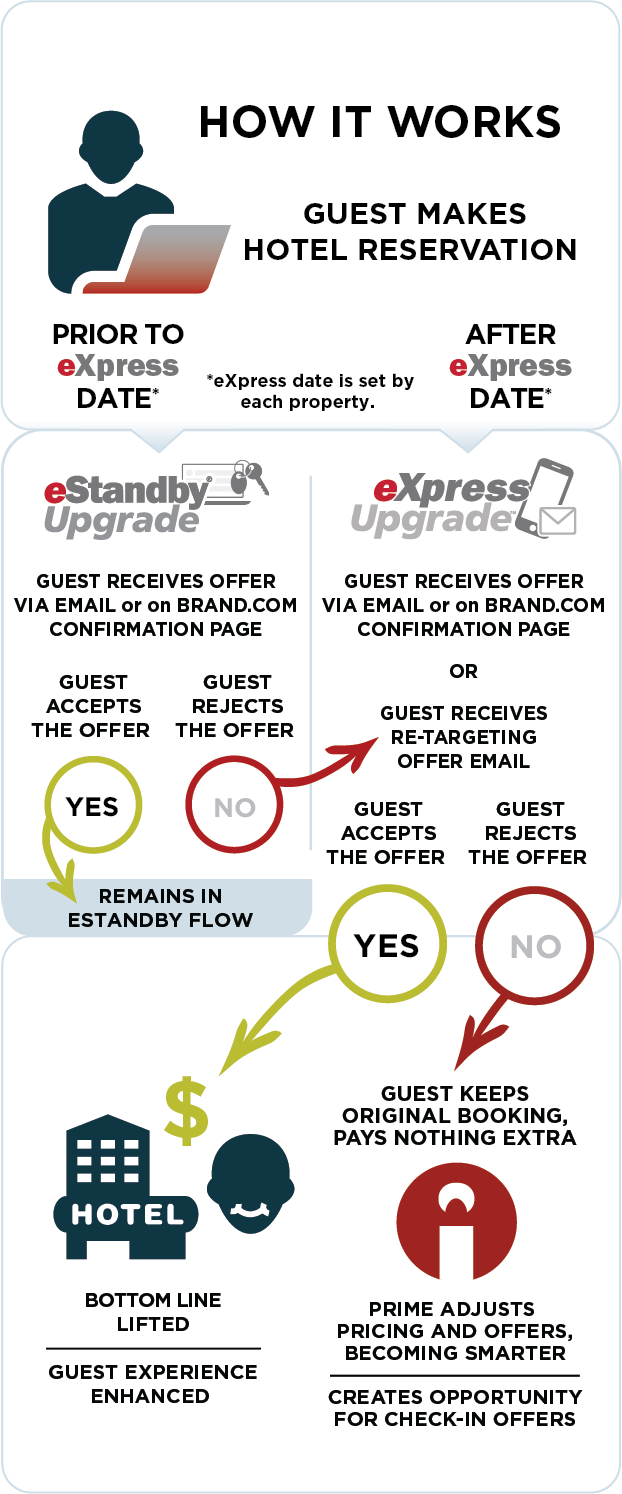 This is a confirmed upgrade that allows hotels to sell last-minute inventory. Hotels decide on a window for this type of upgrade (up to 72 hours before arrival). Guest receives the e-mail with a targeted offer. If the guest accepts the offered upgrade, it is confirmed right away. eXpress upgrade can also be applied to the guests who declined the eStandby upgrade.